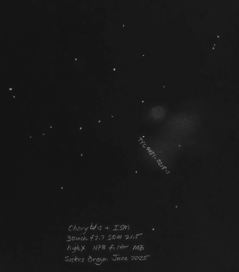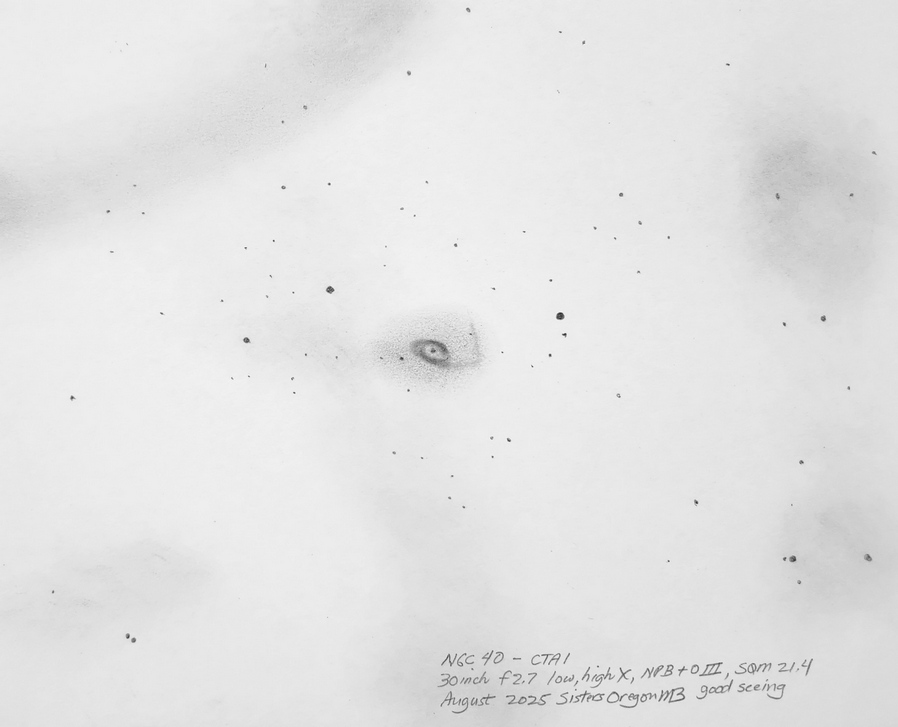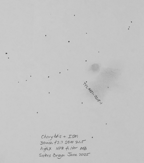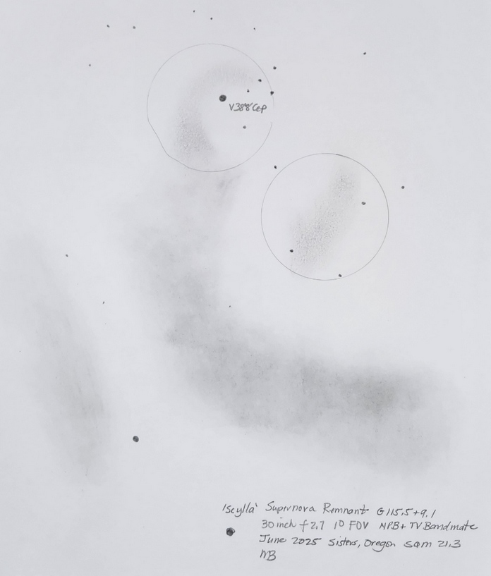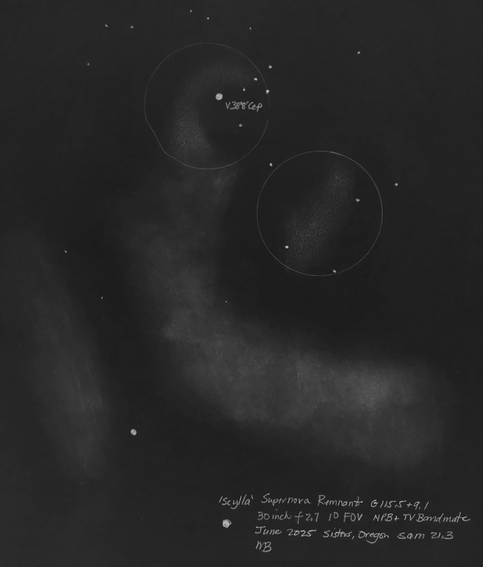 Scylla G115.5+9.1 with the 30 inch f2.7. The two portions of the SN remnant candidate are lightly circled. The discovery image can be found here.