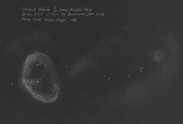 The NHZ-HU6 supernova remnant bubble, 5 deg diameter, 16.25 inch f2.9 with TV Bandmate nebula filter. Digital image here.