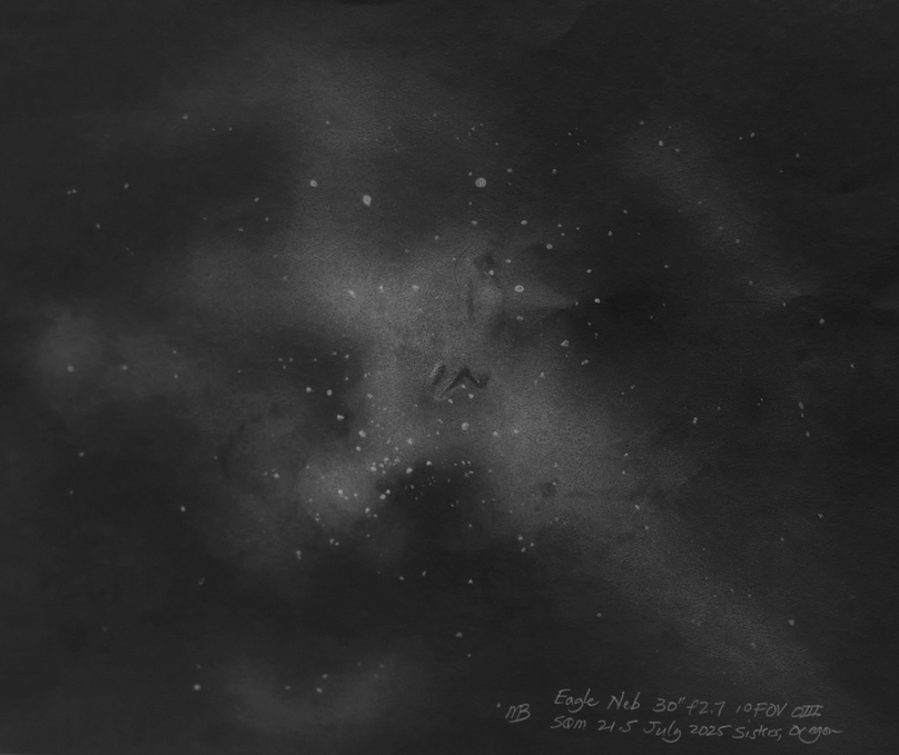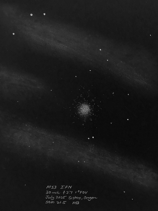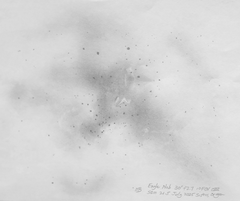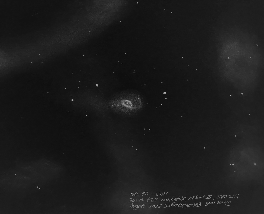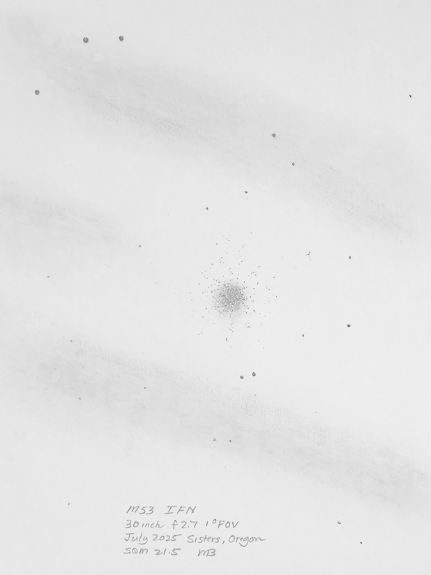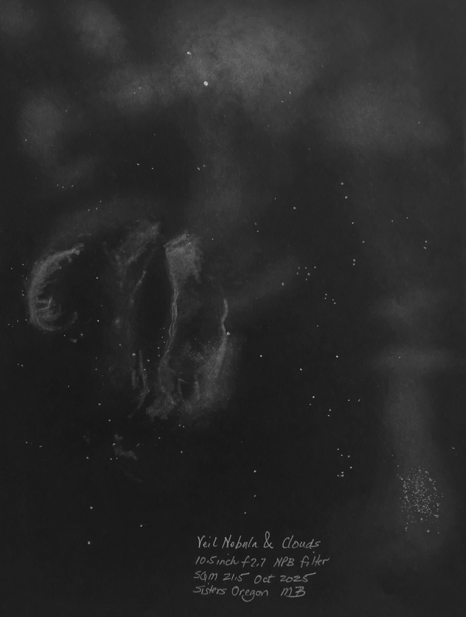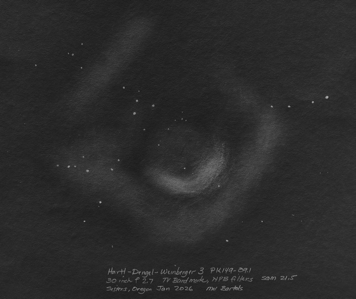Veil Nebula, complete, a mosaic of drawings with the 25 inch f2.6. Western Veil with the 30 inch including the dust cloud to the outside Veil Nebula section, the Witch's Broom, with 25 inch f2.6. Veil Nebula section, the Witch's Broom, with 25 inch f2.6. Veil Nebula, 25 inch f2.6, eastern arc. Veil Nebula section, the triangle tail, with 25 inch f2.6. Though well known, it's rare to see this much detail in the Veil Nebula in a single field of view. Drawn with the 6 inch f2.8. Clouds of nebulosity float around the Veil Nebula. 10.5 inch f2.7 with a NPB filter. G82.2 5.3 W63 SN remnant. Drawn with the 25 inch f2.6. The blue sprites of the Small Sagittarius Star Cloud with the 30 inch f2.7, 1 deg field. See https://www.astrobin.com/full/hirvty/E/ The California Nebula with a 30 inch f2.7, 1 deg field. And the California Nebula is framed nicely in the 4+ degree field of view of the 6 inch f2.8. Crescent Nebula, 30 inch f2.7. Cederblad 214 (NGC 7822). 25 inch f2.6. The Eagle Nebula, OIII filter, 30 inch f2.7. The Elephant's Trunk, 30 inch f2.7, 1 deg field, unfiltered. The Elephant's Trunk, 20 inch f5 at 4mm exit pupil with OIII filter. IC 1396, contains the Elephant's Trunk, 30 inch, 1 deg field, unfiltered. The Iris Nebula. 13 inch f3.0. With my 10.5 inch [27cm] f2.7 Richest Field Telescope, placing the Lagoon Nebula, M8 and the Trifid Nebula, M20, in the same 2.5 degree field of view reveals a curved bridge between the two. A nebulosity (LBN891) next to lamba gem. 30 inch f2.7. Lower's Nebula Sh2-261, LBN 863, with the 25 inch f2.6. The Orion Nebula and surrounding area, 30 inch f2.7, in pastel color. LL Orionis bowshock, 30 inch f2.7, pastels. North American Nebula, Yucatan portion. North American Nebula, SE of Yucatan portion. Nebulae in the NW Cygnus area near Omnicron Cyg and the Propeller, 16 inch f2.9. The Pelican Nebula, 30 inch f2.7, 1 deg field. Propeller Nebula, Simies 57, DWB 111/117. The Raspberry Nebula and Bigfoot. 25 inch f2.6. The Trifid Nebula, M20 and the open cluster, M21, in color, as seen through the eyepiece of my 30 inch f2.7. Zeta Ophiuchi shockwave (inner), 30 inch f2.7. Zeta Ophiuchi Sh2-27. 16 inch f2.9. Abell 12, a faint planetary almost touching Mu Orionis. 13 inch f3.0. Abell 21, the Medusa Nebula. 10.5 inch f2.7. Abell 39 with IFN, 30 inch f2.7 Charybdis, a newly discovered PN candidate with nearby ISM (InterStellarMedium), 30 inch f/2.7, NPB and TV Bandmate filters. The discovery image can be found here. The Ghost of Jupiter, NGC 3242, and a little known nebulosity next to it. The planetary nebula is intense in the 30 inch. Hartl-Dengel-Weinberger 3 PK149-09.1, 30 inch. TV Bandmate and NPB filters. K3-82 planetary. 25 inch f2.6. M27, the Dumbbell, with interstellar medium. 25 inch f2.6. M57 the Ring Nebula along with IC1296 and IFN, in color, using the 30 inch f2.7 along with the 25 inch f2.6. The extended ring's rim is visible in 21.7 skies with OIII filter at 6mm pupil; high power and good seeing for interior stars; intense blue-green with red tinged color. M57 the Ring Nebula along with IC1296, 30 inch f2.7. M57 the Ring Nebula with the 25 inch f2.6, in color. The extended rim is faintly visible. Extended M57 area with the 25 inch f2.6. Broad M57 region showing the IFN and the extended ring with the 15.25 inch f2.9. The Ring Nebula with my 24 inch f5.4. White on black drawing. The Ring Nebula with my 24 inch f5.4, 2nd drawing. Background area around the Ring Nebula. Hickson 50 in the lower left, M97 to the IFN, bathed in faint IFN, 30 inch f2.7. Two planetaries: MWP1 and ALV1 (MWP1 is the large 3 column planetary centered in the drawing while ALV1 is the small circular planetary to the lower right). Streaks of InterStellar Medium also appear. Best viewed with no filter and NPB filter. Both immediately seen while sweeping the area. Necklace Nebula. 25 inch f2.6. NGC 40, CTA1. CTA1 is a supernova remnant. 30 inch f2.7. CTA1. CTA1 is a supernova remnant. 16 inch f2.9. NGC 6751, Hulo 1, V Aquilae carbon star, 30 inch f2.7 at high X. Sh2-216, the largest planetary nebula in the sky at nearly 2 degrees. The Blue horsehead nebula, IC4592 and IC 4601. Rho Ophiuchi region 6 inch f2.8. Rho Ophiuchi region 25 inch f2.6. The Witchhead nebula with my 6 inch F2.8. Cone Nebula, Christmas Tree cluster, 13 inch F3.0. Best view was with the 13mm Ethos and UHC filter at 1.1 deg FOV and 90x. The view at lower power with the 21mm Ethos and 1.8 deg FOV at 55x showed more of the surrounding nebulosity but made the Cone too small and indistinct. At the lower power, the NPB filter worked best. Without a filter, the Cone was hardly there. Cone Nebula, 24 inch, first drawing. IC 1470, NGC 7510, K17, Sh2-157, BFS 19, 30 inch f2.7 Faint Hbeta nebulae from M43 to the Horsehead. 25 inch f2.6. The Rosette Nebula with my 16.25 inch f2.9 and a TV Bandmate nebula filter. The Seagull Nebula. 6 inch f2.8. SH2-264 (Lambda Orionis) wiht the 6 inch f2.8. The Flying Bat and Giant Squid. The Flying Bat is the huge arc to the left of the field and the Giant Squid is the bipolar nebula in the middle of the field. They are known as SH2-129 and OU4. The red carbon star is V419 Cephei. 13 inch f3.0. The Sagitta Bubble (and M71), a large scale object, drawn with the 30 inch f2.7.. A sketch of the newly identified H-alpha bubble, WD-1, and some thoughts on sketching and imaging using the 10.5 inch f2.7.. M3 + IFN using the 30 inch f2.7. M5 + IFN using the 30 inch f2.7. Palomar 5 with the 30 inch f2.7. The clouds of M13, the Great Hercules Cluster, with the 30 inch f2.7. M13, the Great Hercules Cluster, with the 25 inch f2.6, followed by the greater M13 area, 13 inch f3.0. M75 with the 6 inch f2.8, wide field. M92 with the 6 inch f2.8, wide field. NGC 6723 with the Corona Australis IFN The Perseus Double Cluster clouds with the 30 inch f2.7. Compare to James Pelley's image. The Perseus Double Cluster has a wall of nebulosity to one side with a patch of nebulosity to the west side. 6 inch f2.8. The Pleiad