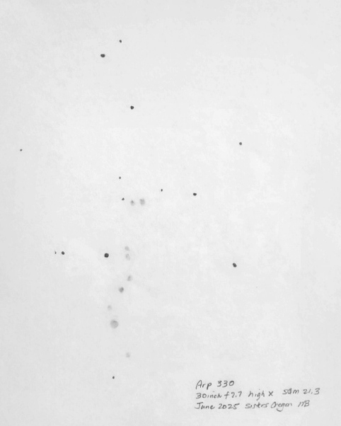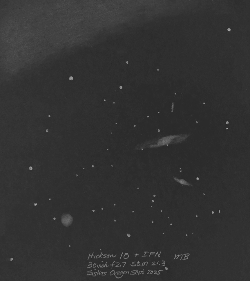 A wide field view of NGC 3310 using the 30 inch f2.7. Here, I move the scope about, creating a drawing by combining fields of view.