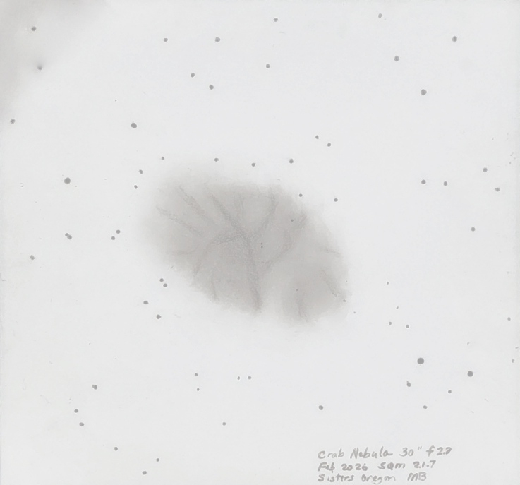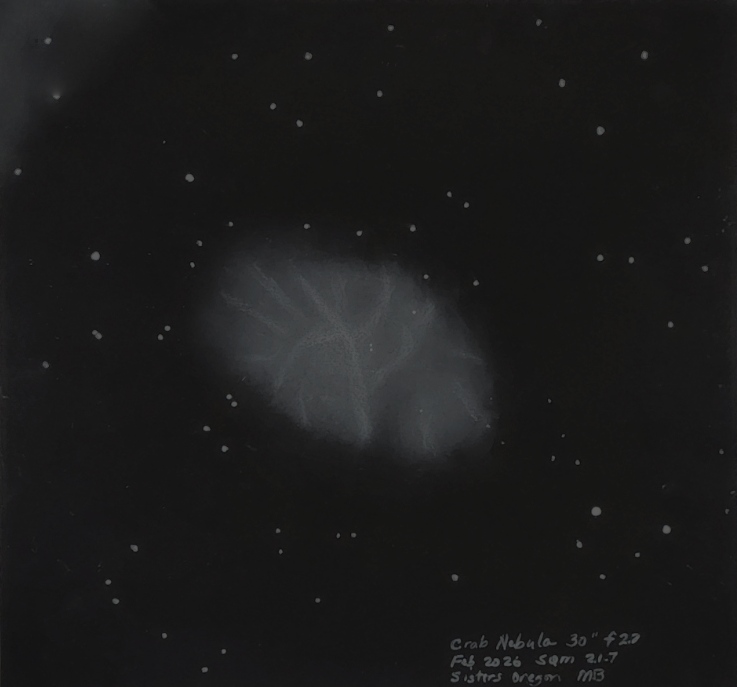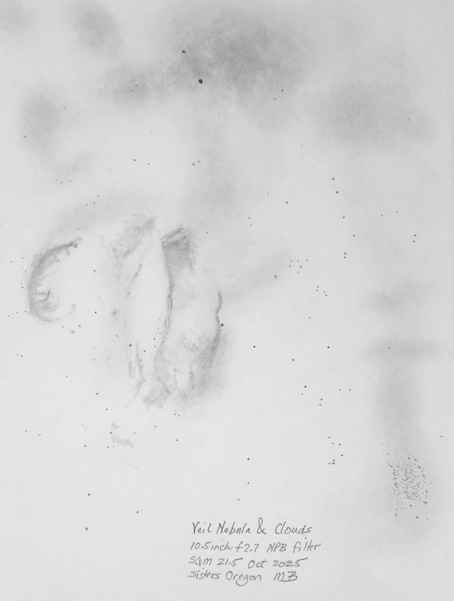 SH2-240, the Spaghetti Nebula (Simeis 147). My impression through my 10.5 inch f2.7 2.5 degree field telescope is first, one of many bright stars with faint broad nebulosity that upon closer inspection shows brighter knots and upon lengthy investigation reveals filaments, particularly the double filament on the SE side. Also visible are several dark splotches.