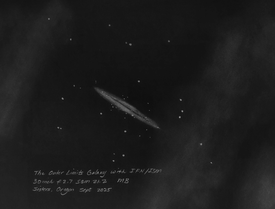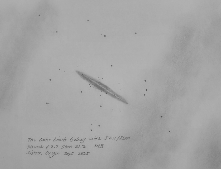Leo Triplet (M65, M66, NGC 3628) with IFN using my 13 inch f3.0. This is a simply beautiful view, the large galaxies with their dusky gray to nearly white hues with the IFN encircling the galaxy trio. For decades I've enjoyed the trio, yet simply failed to notice subtle changes in the foreground glow. I also managed to glimpse portions of NGC 3628's tidal extension that reaches to the IFN. A Skyglow filter helped with the IFN, but dimmed the galaxies.