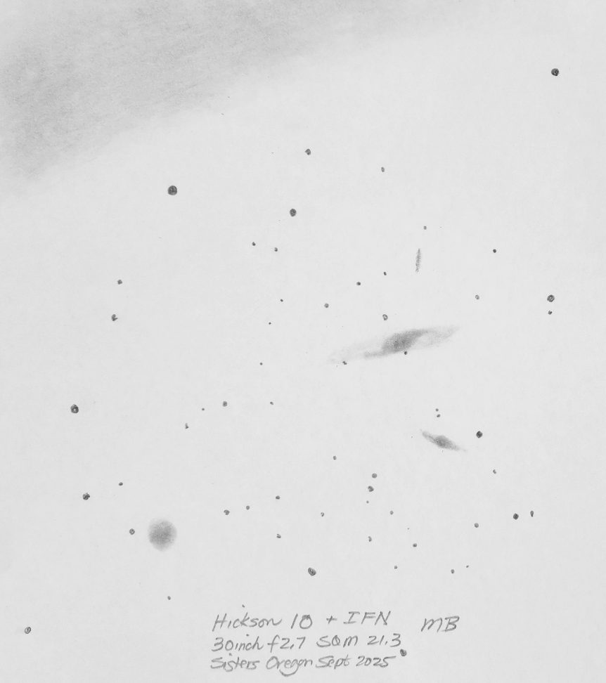 Wide field and highest power field drawings of NGC 3353 with faint IFN streaks. 30 inch f.2.7.