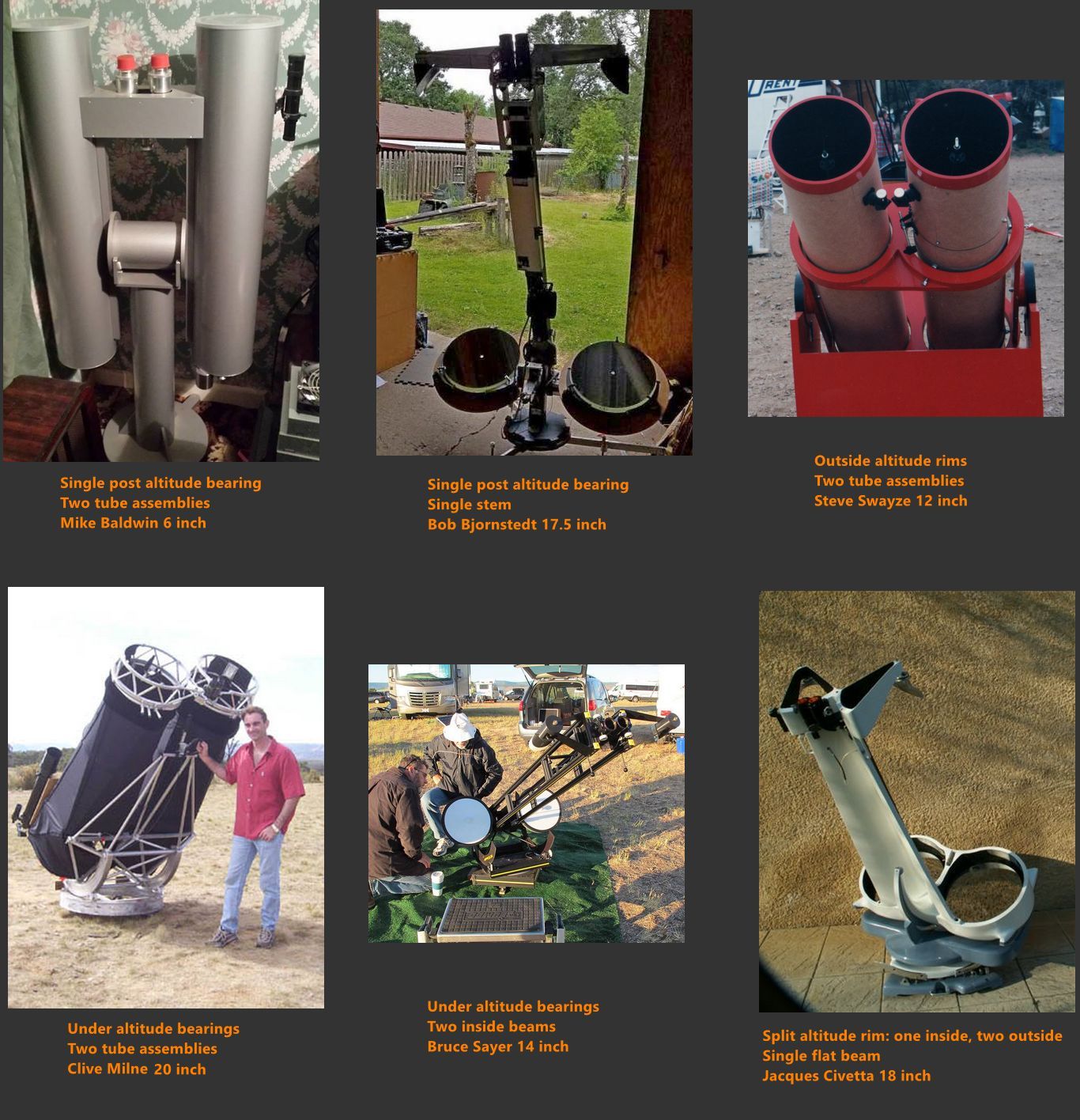 My 10 inch F5 fork, 14.25 inch F5 horseshoe, 20.5 inch F5 TriDob and 25 inch F2.6 3-axis mount.